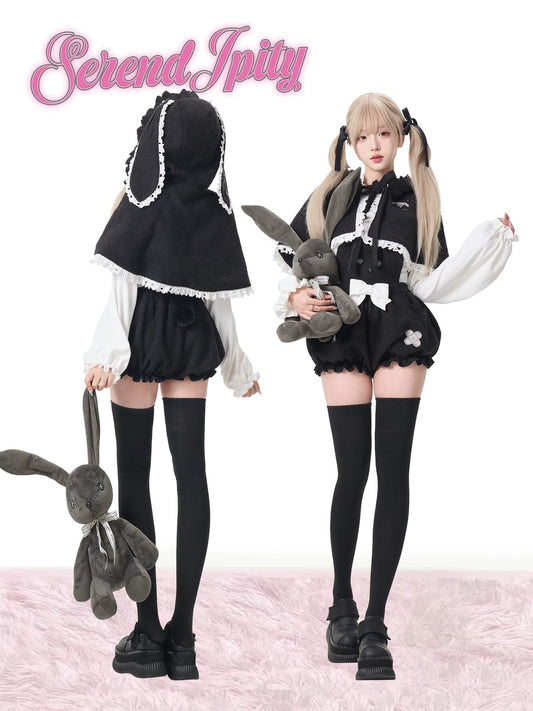 Serendipity Black Bunny Rabbit Hooded Cape Blouse Overalls Three Piece Set