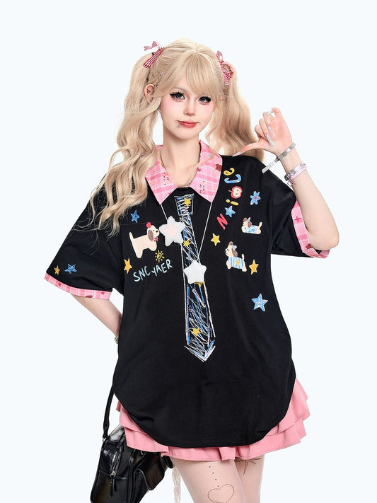 Young Eyes Preppy Polo Cartoon Puppy Black White Shirt