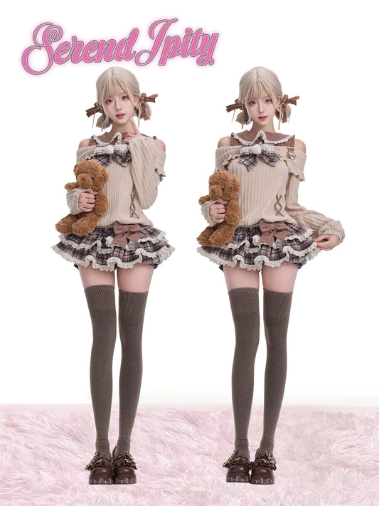 Serendipity Bear Mousse Beige Sweater Brown Plaid Skirt Two Piece Set