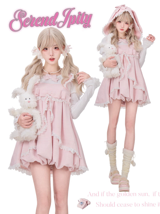 Serendipity Dessert Series Soft Rabbit Pink Hooded Dress White Sweater Two Piece Set