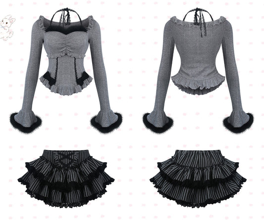 Serendipity Star Gray Velvet Snow Sweater Black Skirt Two Piece Set
