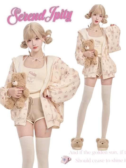 Serendipity Bear Boba Tea Beige Jacket Tank Top Shorts Three Piece Set