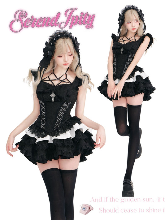 Serendipity Gothic Cross Shadow Black Cami Top Skirt Two Piece Set