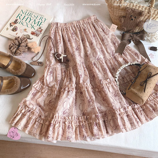 Dormir Doll Pastoral Cottagecore Floral Green Brown Pink Long Maxi Skirt