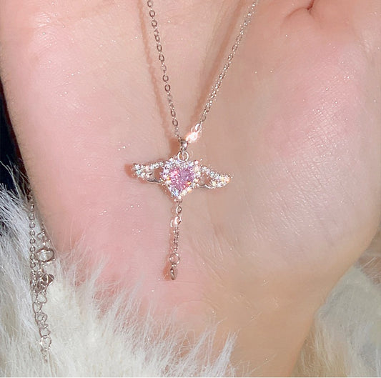 Flapping Wings Pink Heart Silver Necklace Pendant