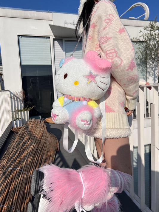 Kitty Cat Cartoon Cute Handmade Y2K Punk Rock Star Plush Doll Backpack Bag