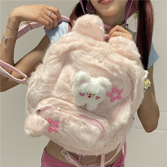 Y2K Bear Cartoon Doll Plush Fluff Cute Mini School Backpack Bag