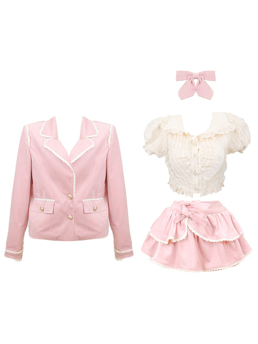 Serendipity Academia Coquette Pink Sweet Cute Blazer Shirt Mini Skirt Three Piece Set