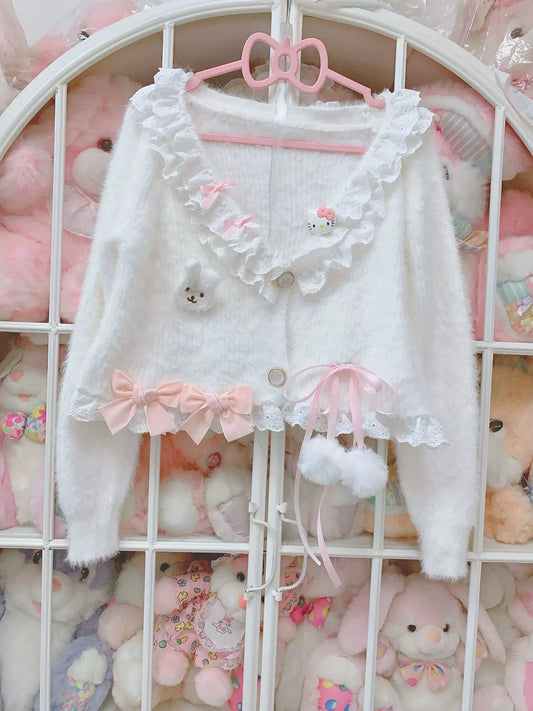 Candy Fairy Milky Kitty Knit White Cardigan & Skirt Two Piece Set