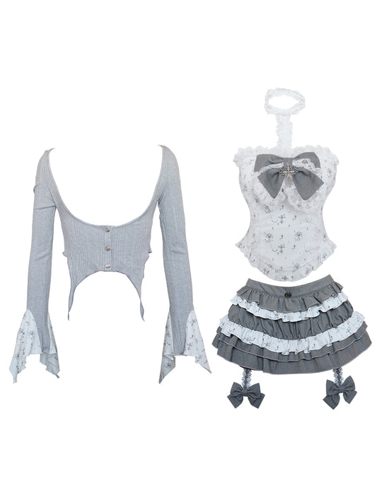 Serendipity Broken Galaxy Gray Tube Top & Cardigan & Skirt Three Piece Set