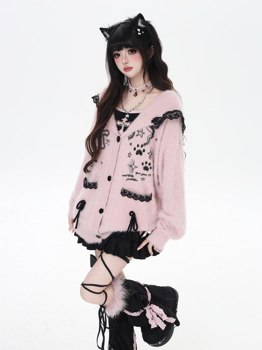 Crazy Girl Lace Bunny Ears Black Pink Fuzzy Cardigan