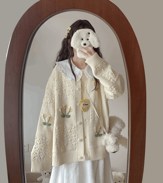 Ninth House Flower Embroidery Purple Cream Cardigan Sweater
