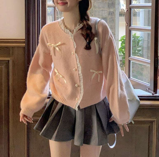 Bow Coquette Sweet Pearl Buttons Tulle Pink Knit Cardigan