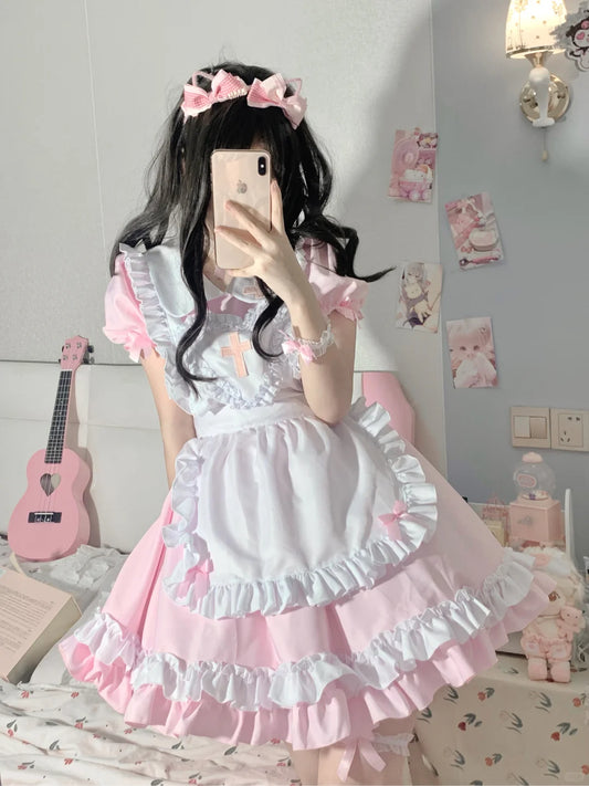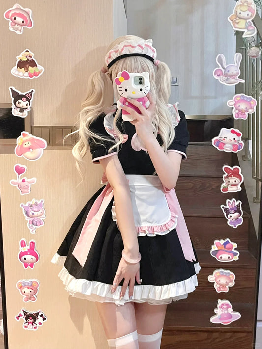 Cute Pink Black Lolita Cosplay Ruffle Maid Dress