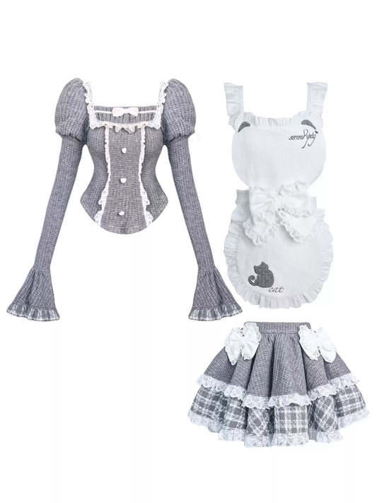 Serendipity Dessert Series Gray Sweater Top & Apron & Skirt Three Piece Set
