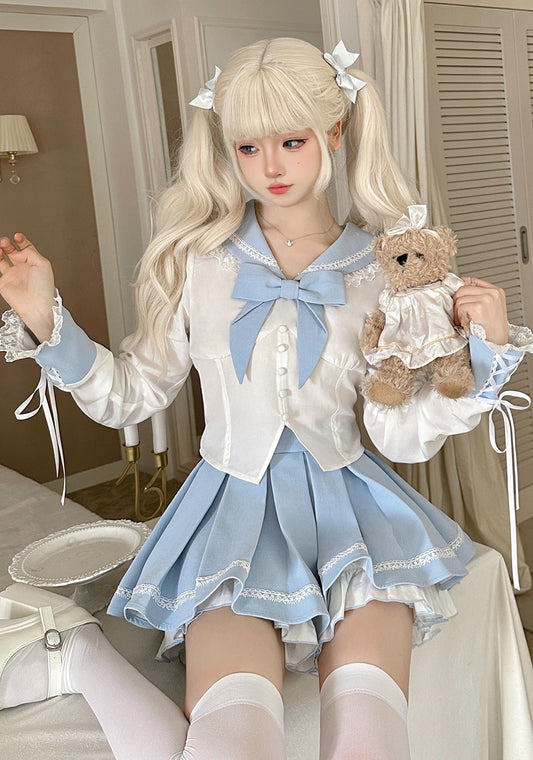 Seifuku Sailor School Uniform Pastel Blue White Blouse Shirt & Skirt Two Piece Set