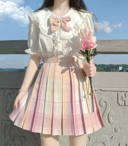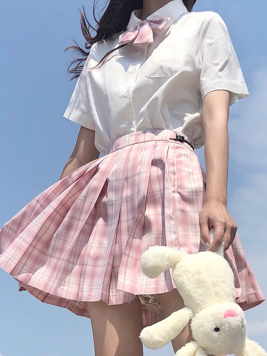Plaid Pink Cherry Blossom Student Uniform Seifuku Shirt Skirt Bow Tie Two Piece Set