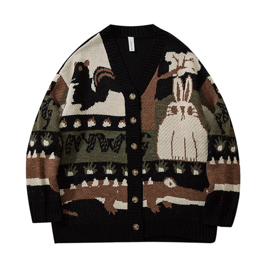 Cottagecore Rabbit Squirrel Crocodile Family Forest Knit Brown & Black Cozy Cardigan