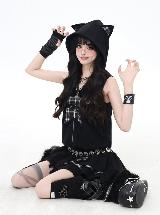 Crazy Girl Cat Ears Star Plaid Black & Red Cut Off Hoodie Dress