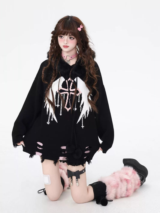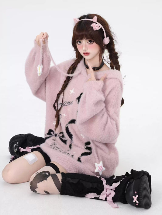 Crazy Girl Sticky Bow Black Pink Fuzzy Sweater Hoodie