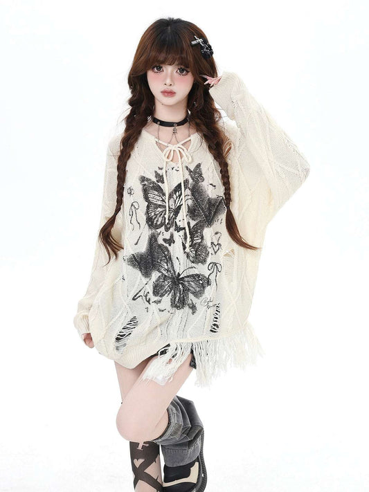Crazy Girl Deep Wild Butterfly Black Cream Sweater Top