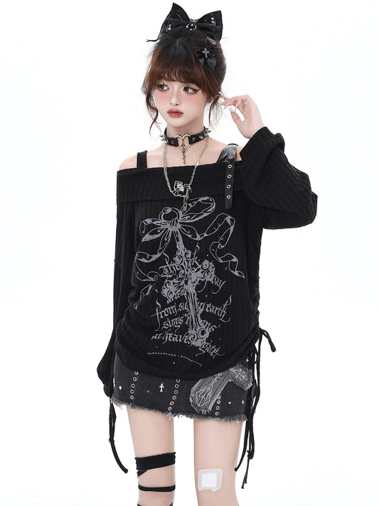Crazy Girl Cross Bow Off Shoulder Black White Cream Sweater Top