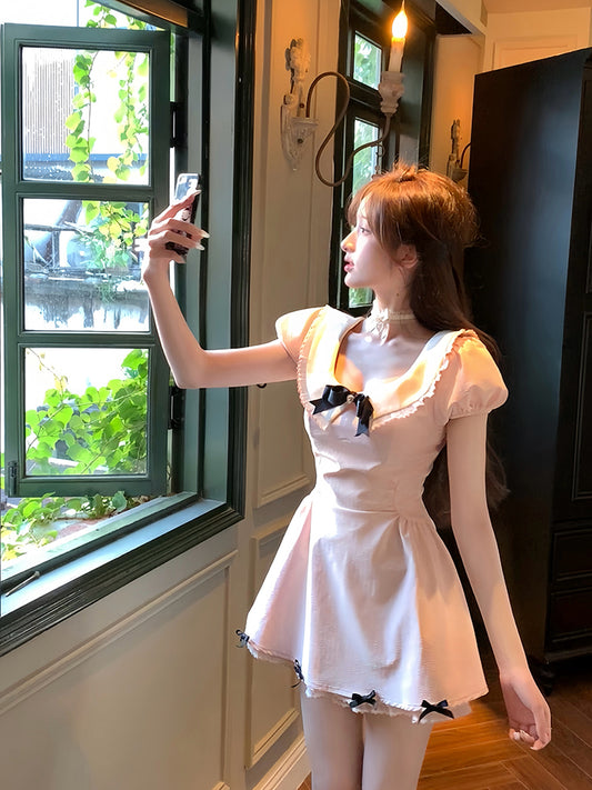 Creamy Cute Passion Pink Navy Blue Puff Sleeve Dress