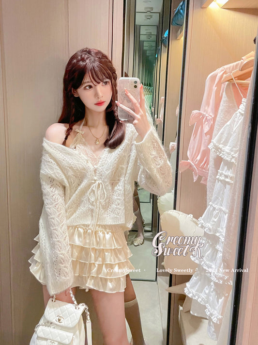 Creamy Cute Lazy Beauty White Lace Cami Cardigan Two Piece Set