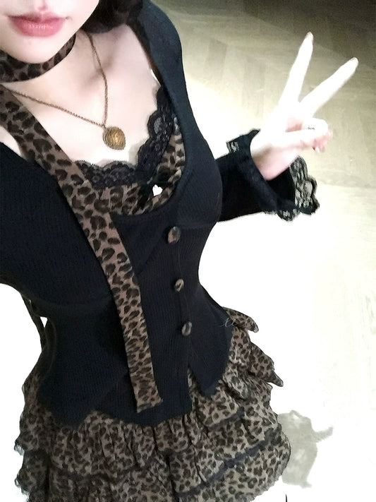 Creamy Cute Leopard Cat Black Top & Brown Skirt Two Piece Set