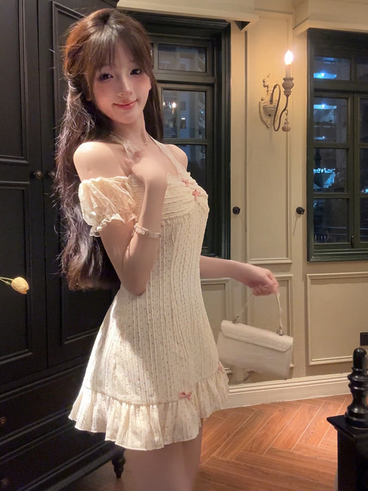 Creamy Cute Strawberry Milkshake White Halter Off Shoulder Dress