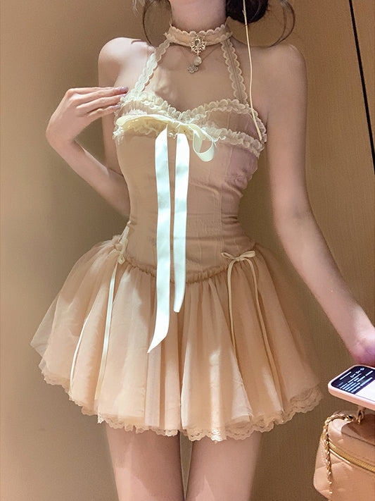 Creamy Cute Early Spring Halter Neck Pink Dress