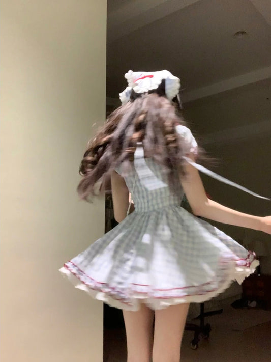 Creamy Cute Grimm's Fairy Tale Blue Plaid Puff Sleeve Dress