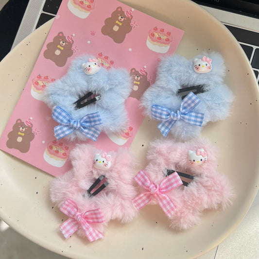 Y2K Star Plush Plaid Blue Pink Kitty Cat Hair Clip Hair Accessories