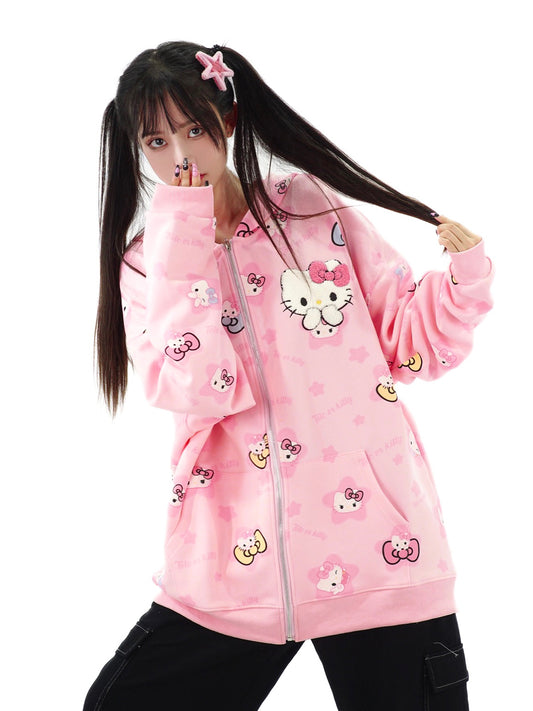 Cute Kitty Cat Print Pink Green Camouflage Y2K Oversize Hoodie Jacket