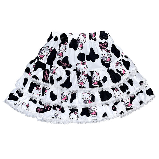 Y2K Harajuku Black White Cow Pattern Kitty Punk Rock Girl Gathered Elastic Short Mini Skirt