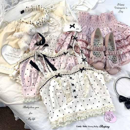 Dormir Doll Satin Doll Polka Dot Pink White Camisole & Skirt Two Piece