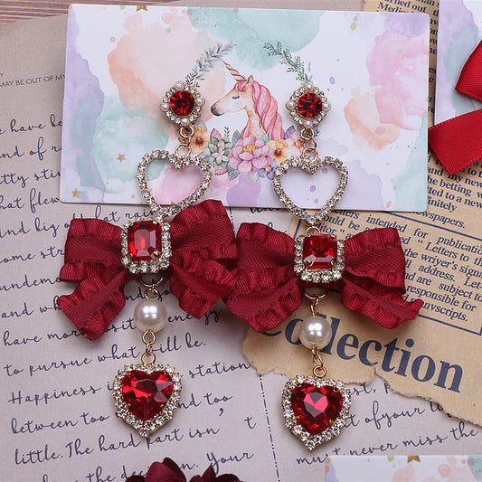 Ruby Gem Pearl Heart Love Burgundy Scarlet Red Bow Earrings