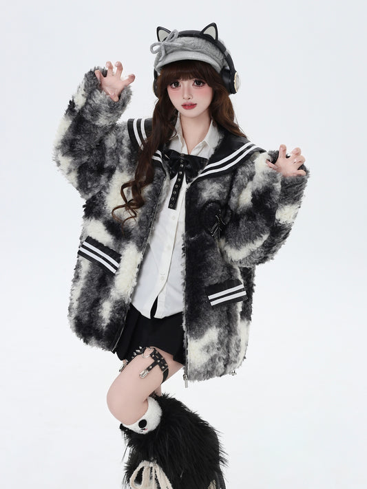 Crazy Girl Black & White Sailor Collar Fleece Plush Jacket