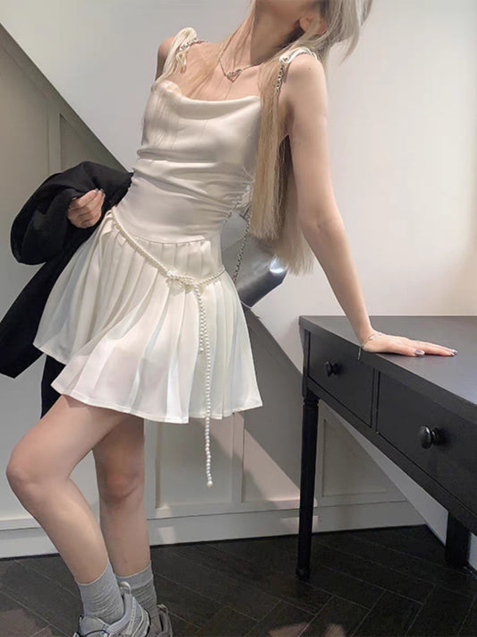 Pearl Chain Balletcore Elegant Cute Suspender Strap Bow Pleated White Silver Satin Dress