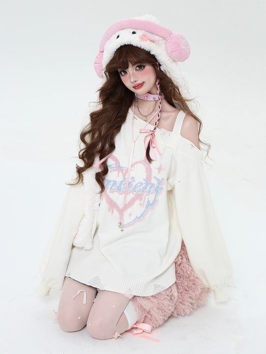 Crazy Girl Sentient Heart Black White Pink Blue Knit Off Shoulder Sweater