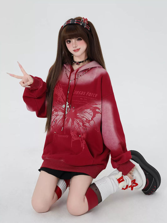 Crazy Girl Gradient Butterfly Black Red Pullover Hoodie