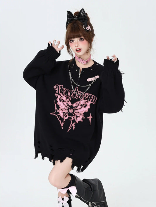 Crazy Girl Daydream Butterfly Black White Pink Red Knit Sweater