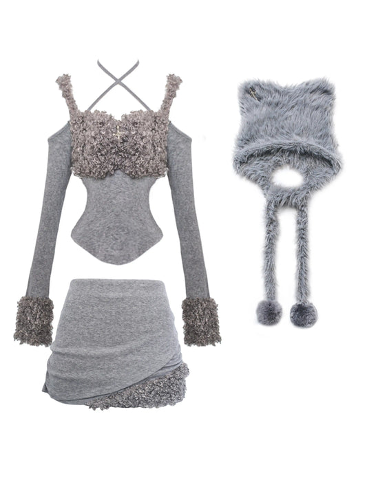 Serendipity Little Gray Cub Sweater Top & Skirt & Hat Three Piece Set