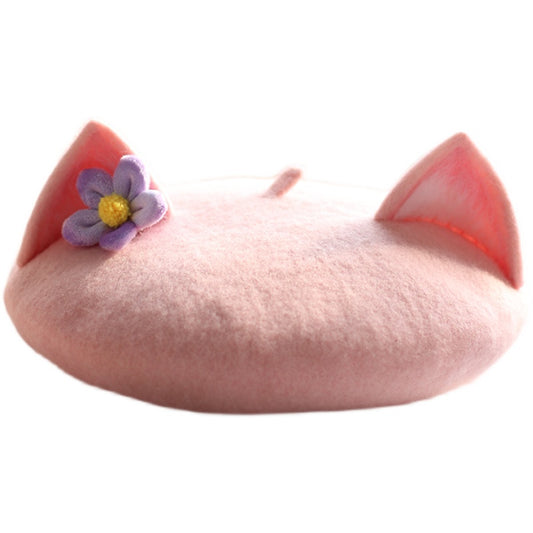 Cute Pink Cat Ears with Purple Flower Beret Hat