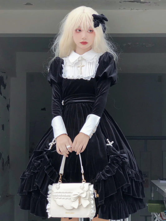 Cross Hymn Black Gothic Lolita Long Sleeve Velvet Dress