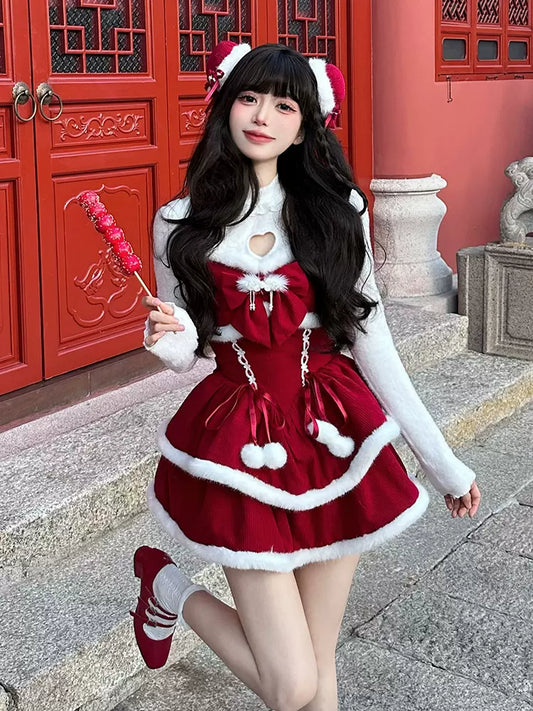 Lolita Teddy Bear Christmas Festive Red White Winter Jacket & Strap Dress Two Piece Set