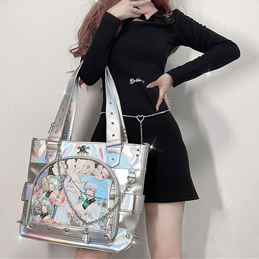 Gothic Black White Silver Holographic Skull Chains Messenger Bag