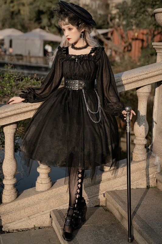Blood Supply Dark Gothic Dream Rose Lace Drawstring Velvet Puff Sleeve Dress