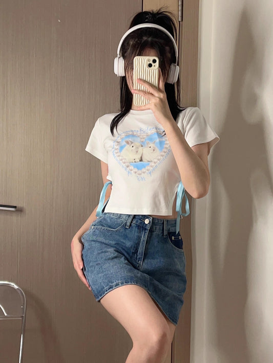 Heart Frame Sweet Cute Y2K Rabbit Ribbon Pink Blue Black Short Sleeve T-Shirt Top