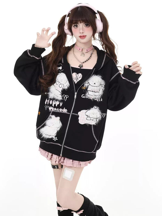 Crazy Girl Puppy Picnic Blue Black Hoodie Jacket